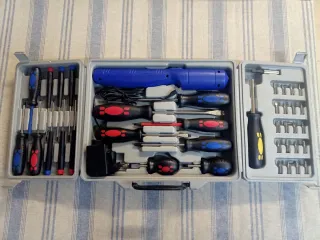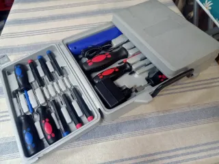 Práctico set de destornilladores, incluye atornillador eléctrico recargable, múltiples puntas y destornilladores de diferentes tamaños. - Estuche organizador para fácil transporte.