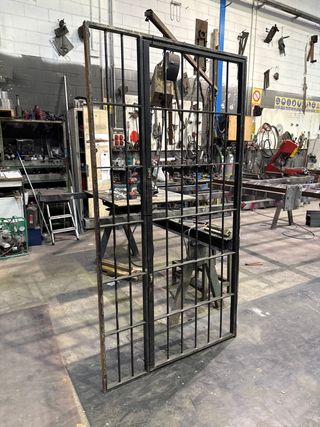 Puerta de reja metálica, con un diseño robusto y reforzado. 1200 ancho por 2200 alto medidas en milímetros.  - Estructura de metal. Hierro - Diseño de barrotes verticales. Pintado de negros.