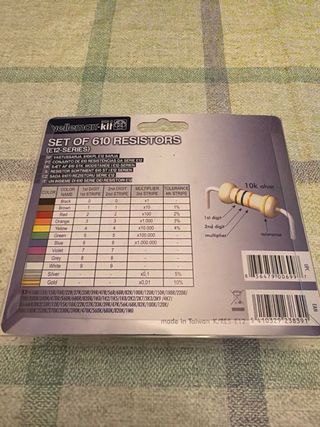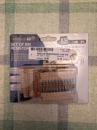 Pack de unas 600 resistencias de la serie E12 de Velleman. - Potencia: 1/4W. - Tolerancia: 5%. - Rango de valores: de 10 Ohm a 1M Ohm. - Voltaje máximo de operación: 250V.