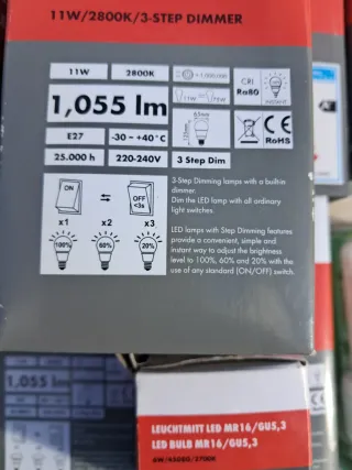 Se vende lote de 10 lámparas LED E27 de luz cálida (2800K) mas 3 . Son de la marca LEUCHTMITTEL LED modelo CLASSIC E27 y tienen una potencia de 11W con 1.055 lúmenes. Son de 3 pasos de dimmer. - Lote de 7 lámparas LED. - Casquillo E27. - Luz cálida 2800K. - Potencia 11W. - Flujo luminoso 1.055 lm. - 3-Step Dimmer.