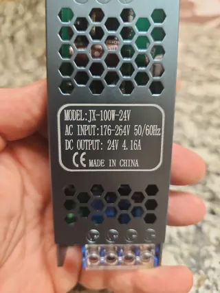 Fuente de alimentación para tiras LED. - Modelo: TX-100W-24V. - Entrada AC: 100-240V, 50/60Hz. - Salida DC: 24V, 4.16A.