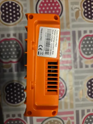 Regulador de carga solar MPPT de 60A. Diseñado para sistemas de 12V, 24V, 36V y 48V. - Tecnología MPPT para máxima eficiencia. - Pantalla digital para monitoreo. - Botones de control. - Carcasa naranja. Disipador de aluminio y ventilación forzada.