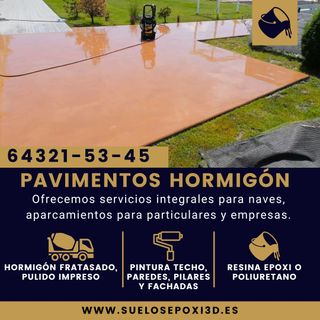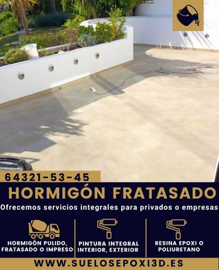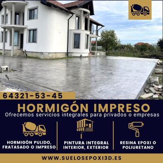 💯 Realizamos trabajos de HORMIGÓN IMPRESO FRATASADO y PULIDO para particulares y empresas! HORMIGÓN IMPRESO: ideal para patios, terrazas o entradas de vehículos. 🎨 Zonas con diferentes diseños y colores. 💪🏼 Material resistente y duradero. 🫧 Fácil de limpiar y mantener. PRECIOS EN FUNCION DE: -si la obra necesita alguna clase de preparación; -de los metros que quiere hechar; -si el camión de hormigón se queda cerca de la obra o tiene acceso. !PIDEN SU PRESUPUESTO SIN COMPROMISO O UNA VISITA A PIE DE LA OBRA! 📞 Tel de contacto: 64321-53-45 ✉️ Correo electrónico: contacto@suelosepoxi3d.es 🔎 WB:suelosepoxi3d.es