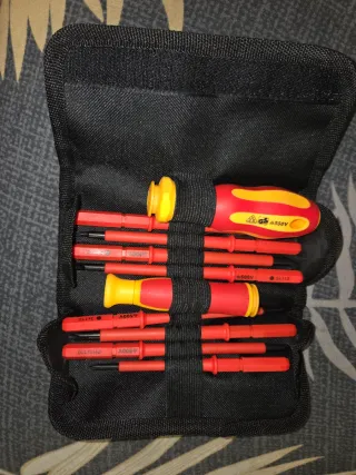 Set de destornilladores aislados, ideales para trabajos eléctricos. - Mango ergonómico de dos componentes. - Varilla de acero cromado. - Punta con acabado fosfatado. - Incluye estuche para guardarlos.