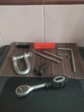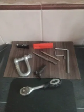 Conjunto de herramientas manuales para diversas tareas. - Llaves Allen - Destornilladores - Llaves fijas - Abrazadera metálica