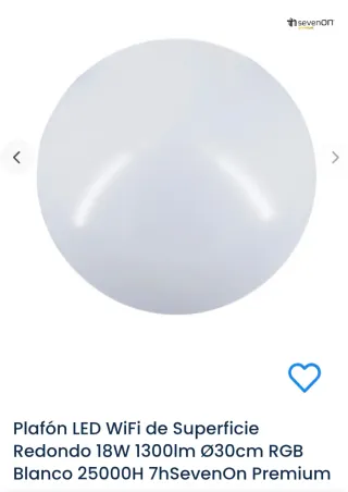 Plafón LED de superficie redondo con conectividad WiFi y luz RGB..sin abrir nuevo - Potencia: 18W. - Flujo luminoso: 1300 lúmenes - Diámetro: 30 cm. - Color: Blanco - Duración: 25000 horas Para espacios interiores, Ø30x8 cm (diámetro x altura). 18W potencia, 1300 lúmenes y ángulo de apertura 120°. Temperatura de color RGB, conexión WiFi mediante App. Bombillas 💡 (SOLO ME QUEDAN 8 ) 7hSevenOn Premium, indicado especialmente para espacios interiores como salones, comedores, recibidores y cocinas. Fabricado en combinación de plástico PP y aluminio de color blanco con acabado mate. Cuenta con 18W de potencia, samsung LG