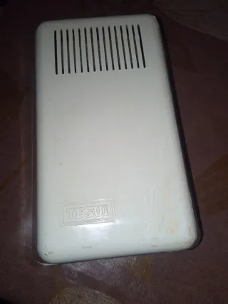 Fuente de alimentación de la marca TEGUI, modelo E-10. Diseñada para diversas aplicaciones. - Color blanco. - Diseño rectangular con rejilla superior. - Logotipo de la marca grabado en la parte frontal.