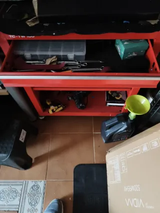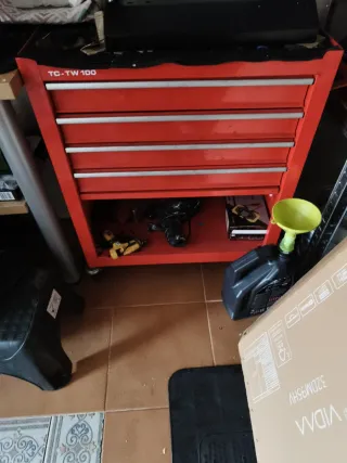 Cajón de herramientas de color rojo con el modelo TC-TW 100. Cuenta con varios compartimentos para organizar tus herramientas. - Estructura metálica. - Cuatro cajones. - Compartimento inferior abierto. Sin herramientas