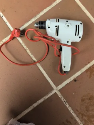 Taladro eléctrico vintage de color blanco. Un clásico para tus proyectos. - Cable de alimentación rojo. - Enchufe de tres clavijas.