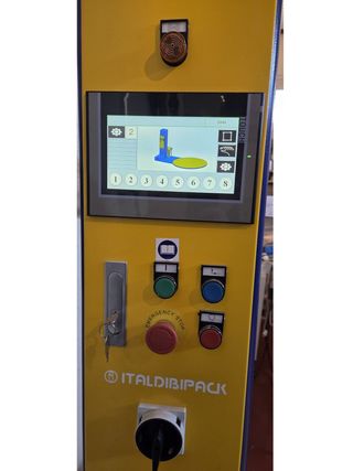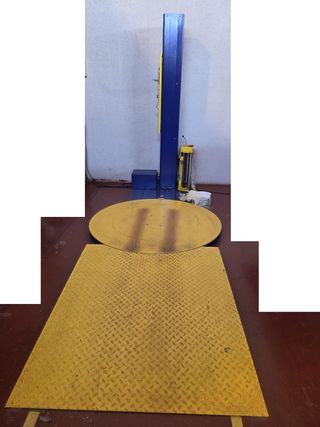 Máquina enfardadora de palets para envolver cargas paletizadas - Plato giratorio de 1500 mm de diámetro - Columna de soporte azul y amarilla. - Rampa de acceso para traspalet manual Altura 2,20 mts Carga máxima 2000 kgs Regulación de número de vueltas de refuerzo Regulación velocidad de la plataforma y del carro portabobinas Pantalla táctil con memorias de parámetros Máquina muy nueva con poco uso. Posibilidad de instalación en cliente por un técnico