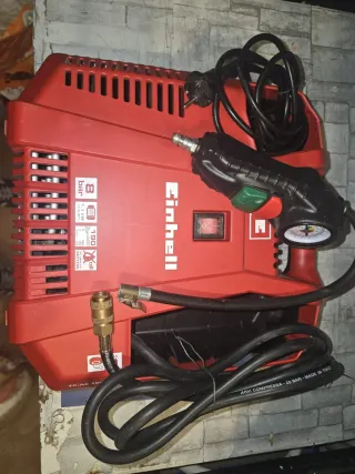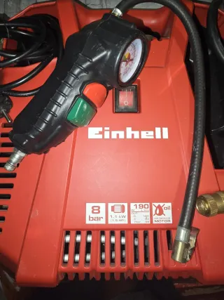 Compresor portátil de la marca Einhell. - Presión máxima de 8 bares. - Potencia de 1.1 kW (1.5 HP). - Modelo TC-AC 190. - Motor sin aceite (Oil-free). - Fabricado en Italia.