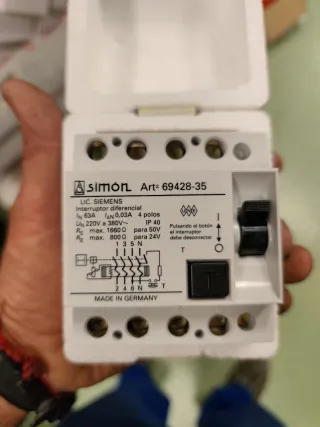 Interruptor diferencial de la marca Simón, modelo Art. 69428-35. - 4 polos. - Intensidad nominal (IN): 63A. - Corriente diferencial residual (IΔN): 0,03A. - Tensión nominal (UN): 220V a 380V~. - Grado de protección: IP 40. - Fabricado en Alemania.