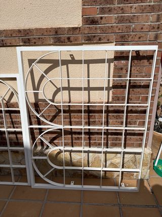 Conjunto de rejas de acero en color blanco, con un diseño ornamental. Retiradas por reforma - Estructura de acero. - Acabado en blanco.