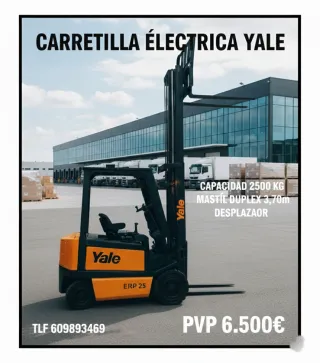 Carretilla elevadora eléctrica Yale ERP 25 en venta - Capacidad de carga: 2500 kg. - Mástil dúplex de 3,70m. - Desplazador lateral. - PVP: 6.500€. - TLF: 609893469. #yale #linde #still #toyotq