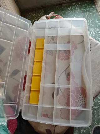 Práctico organizador de plástico transparente con múltiples compartimentos. - Ideal para guardar tornillos, piezas pequeñas o material de manualidades. - Incluye una bandeja extraíble de color amarillo. - Diseño con tapa abatible para proteger el contenido.