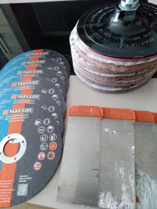 Lote de utensilios de la marca Parkside. Seis discos y otros,dos depiloos - Cepillo de copa para amoladora (PNWSZ 3 B3). - Barras universales para pistola termoselladora (PNNPZ 3 B2).