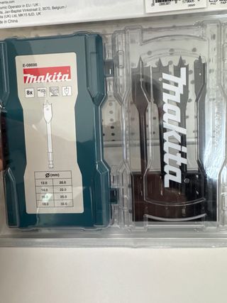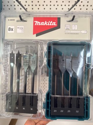 Set de 8 brocas pala de la marca Makita. - Incluye brocas de los siguientes tamaños: 12, 14, 16, 18, 20, 22, 25 y 32 mm. - Ideales para trabajos en madera.