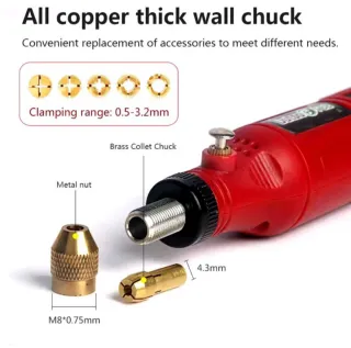 Mini taladro recargable por USB, ideal para trabajos de precisión. - Velocidad máxima de 16000 rpm. - Voltaje de 3.7V. - Pinza de sujeción de 0.5-3.2mm. - Diseño compacto: 157mm*37mm. - Indicador de marcha.