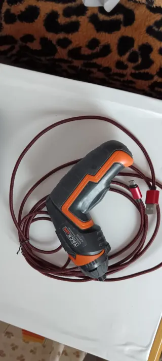 Mini taladro TACKLIFE SDP510C con cable de carga USB. - Diseño ergonómico en color negro y naranja. - Incluye cable de carga USB con conectores USB y micro USB.
