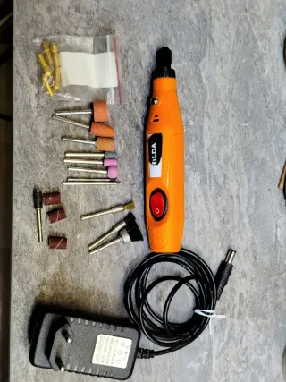 Mini herramienta rotativa de 130W completamente nueva, sin uso, en su caja original. Incluye cajita/maletín con múltiples accesorios para realizar todo tipo de trabajos como corte, lijado, pulido, grabado o taladrado. Cuenta con velocidad regulable, es fácil de manejar. Entrega en mano o envío.