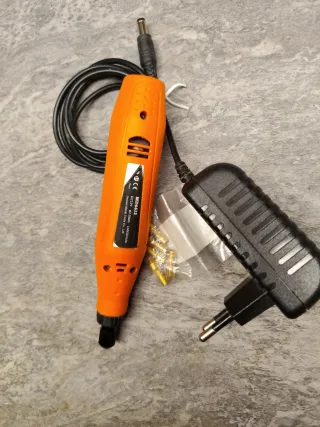 Mini taladro eléctrico de la marca HILDA, ideal para trabajos de precisión. - Incluye adaptador de corriente. " No es inalámbrico" - Viene con varios accesorios que se ven en la foto - Diseño ergonómico en color naranja. Tiene las pegatinas un poco sueltas, pero funciona perfectamente lo usé muy poco