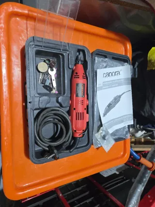 Mini taladro multifunción de la marca CANORA, modelo 1509180. Apenas uso en perfecto estado y funcionamiento. - Cabezal desmontable para adaptadores. - Escobillas nuevas de repuesto. - Asa para colgar. - Instrucciones de uso. - Variador de velocidad de 8000-30000 rpm. - Incluye varios accesorios para diferentes trabajos. - Maletín original para un fácil almacenamiento y transporte. - Cable de alimentación con enchufe europeo de 2mt de largo.