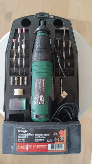 Mini taladro de la marca Parkside, ideal para trabajos de grabado y modelismo. Su diseño compacto lo hace fácil de manejar. - Incluye estuche para guardarlo.