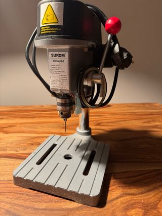 Mini taladro de banco SUROM, ideal para trabajos de precisión. - Voltaje: 220V-50Hz - Potencia: 340W - Velocidad sin carga: 0-8000RPM / 0-11000RPM / 0-16000RPM - Profundidad máxima de perforación: 25mm