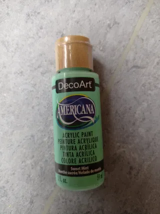 Pintura acrílica de la marca DecoArt, línea Americana, en el color Sweet Mint. El envase está en muy buen estado. - Color: Sweet Mint - Marca: DecoArt Americana - Tipo: Pintura acrílica - Contenido: 59 ml (2 fl. oz.)