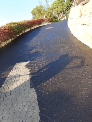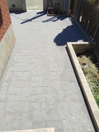 Bonito pavimento de hormigón impreso para exterior. Ideal para patios o jardines. - Diseño tipo adoquín. - Color gris oscuro. - Resistente y duradero.
