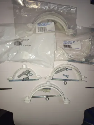 Se vende un kit de abrazaderas lacadas en blanco, ideal para instalaciones. - Incluye abrazaderas de diámetros 125, 100 y 80mm. Cantidad: 125mm (8 unidades) 3€ unidad. 80mm ( 15 unidades) 1€ unidad. 100mm (11 unidades) 2€ unidad. - Cada abrazadera viene con sus tornillos y tacos correspondientes. Pedido mínimo 5 unidades Precio por unidad 1€ Por todo el stock de 34 unds 50€