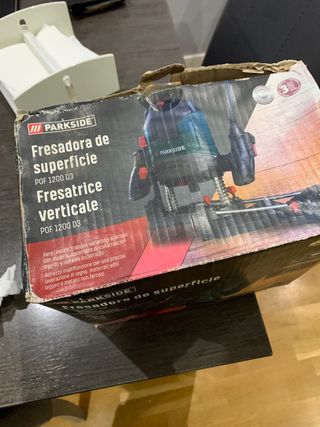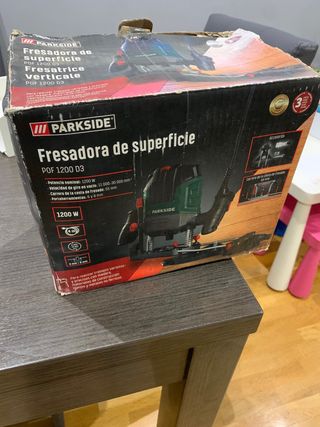 Fresadora de superficie PARKSIDE POF 1200 D3. - Potencia nominal: 1200 W. - Velocidad de giro en vacío: 11000-30000 min-1. - Carrera de la cesta de fresado: 55 mm. - Portaherramientas: 6 y 8 mm. - Cable de 4 m.