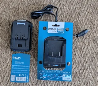 NO OFERTAS NUEVO sin embalaje original Cargador y batería de litio Koma Tools PRO Series. - Apta para todos las herramientas Koma tools - Con indicador del estado de carga - Con pestaña de bloqueo y 5 ranuras de conexión - Sistema de control de temperatura - Protección anti golpes - Batería de 2.0Ah.