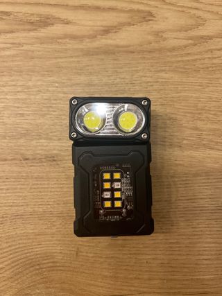 Linterna con dos potentes luces LED frontales y un panel de seis luces LED en la parte trasera. - Diseño robusto y compacto. - Panel trasero con múltiples LEDs.