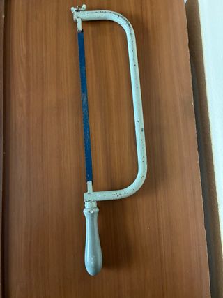 Herramienta manual con arco de sierra, diseñada para realizar cortes detallados y limpios. - Mango de madera para un agarre cómodo. - Marco metálico resistente. - Hoja de sierra fina.