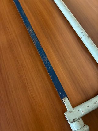 Sierra manual con marco de metal y hoja azul. - Mango ergonómico para un agarre cómodo. - Marco de metal resistente.