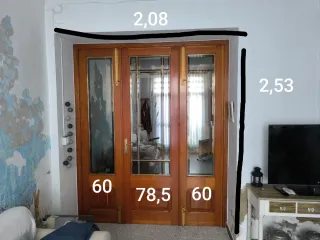 Puerta de paso de madera con tres secciones. - Medidas totales: 2,08 m de ancho x 2,53 m de alto. - Cada hoja mide 60 cm, 78,5 cm y 60 cm.