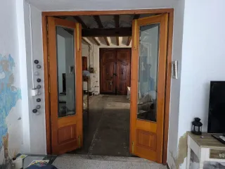 Par de puertas antiguas de madera maciza, con un acabado rústico y elegante. - Fabricadas en madera maciza. - Diseño clásico con paneles. - Ideales para proyectos de restauración o decoración.