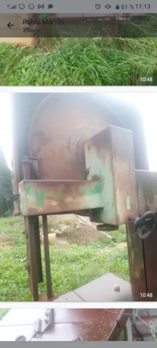 Sierra de cinta de uso industrial, robusta y lista para trabajar. - Estructura metálica. - Superficie de corte amplia. - Número de serie visible '2'.