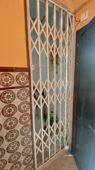 Reja de seguridad metálica, ideal para proteger accesos. 2,35 sin marcó alto cancela, 2,37-2,40 con marco 77 centímetros ancho aproximadamente - Estructura de metal resistente. - Diseño extensible tipo tijera. - Color blanco.
