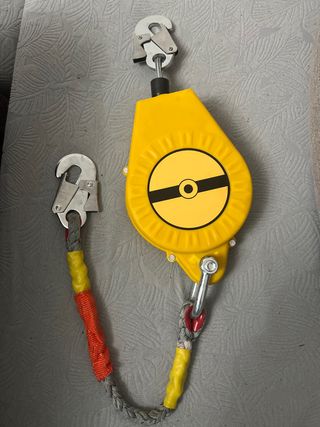 Sistema de retención anticaídas con cable retráctil. - Longitud del cable: 10 metros. - Capacidad máxima: 150 kg. - Carcasa de plástico amarillo resistente. - Mosquetones de seguridad metálicos.