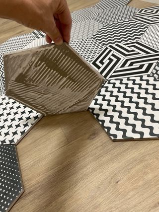 Conjunto de baldosas hexagonales con diversos diseños geométricos en blanco y negro. - Diseños variados: zig-zag, puntos, líneas, damero, etc. - Formato hexagonal. - Apta para decoración de interiores. - Regalo dos que tienen una pequeña picadura. - Son todas las que aparecen en la foto.