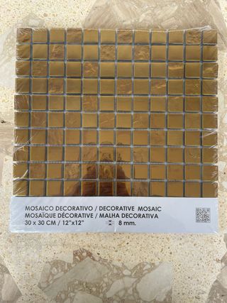 Pack de mosaicos decorativos con acabado dorado. Perfectos para dar un toque elegante a cualquier espacio. - Medidas: 30 x 30 cm / 12x12 - Grosor: 8 mm. - Diseño: Mosaico decorativo / Decorative mosaic dispongo de 16 unidades 120,00 € pack completo 10,00 € unidades sueltas