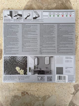 Mosaico auto adhesivo piezas cuadradas metálicas, dorso auto adhesivo sin necesidad de cementos, fácil instalación y sin escobros, fijación de alta resistencia, sólo para uso en estancias interiores. Una unidad disponible de 30x30 cm (0,09 m2). Entrega en mano en Rivas-Vaciamadrid. Posibilidad de envío.
