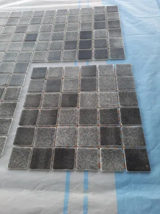 Mosaico de gres ideal para piscinas. Se vende en láminas, tienen los protectores todavía puestos y en su caja Aprovecha para hacer ahora esas reparaciones pendientes en tu piscina - Diseño cuadrado azul, nuevo sin estrenar. Cada placa cuadrada tiene 12 gresites de lado (2,5 × 2,5 gresite) que equivale a 30cm2. Fabricado en España Dispongo de 33 placas a 4 euros cada una, si llevas todas a 110 eur lote (superficie total 9,90 m2)