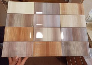 Baldosa tipo mosaico con un diseño de rayas degradadas en tonos marrones y beige. Aporta un toque moderno y elegante a cualquier espacio. - Acabado brillante. Baldosas estilo mosaico Color brillante Nuevas Medida 31,6x45 9 unidades (1 paquete entero) Revestimiento Marca Realonda Comprado en Ferrolan