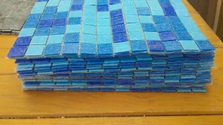 Conjunto de baldosas de estilo gresite con un diseño de mosaico en tonos azules. Casi 3 m2 - falta 2 baldosas para completar 3m . Para un ducha sobra. 33*33 - Ideal para piscinas o decoración. - Patrón de mosaico variado.