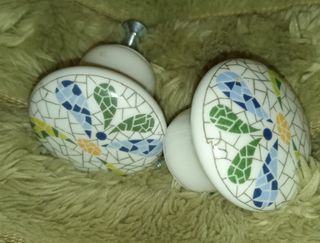 Dos tiradores redondos de cerámica con un diseño inspirado en mosaicos. - Diseño de flores en tonos azul, verde y amarillo. - Acabado brillante con detalles en gris. - Ideales para dar un toque decorativo a muebles.