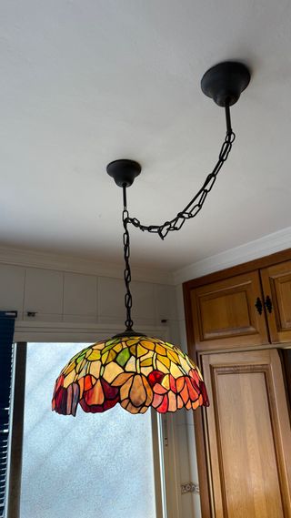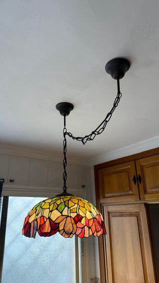 Elegante lámpara de techo con diseño de mosaico estilo Tiffany. Su pantalla de cristal aporta un toque de color y calidez a cualquier estancia. - Pantalla de cristal con diseño de mosaico. - Colores vibrantes y variados. - Cadena metálica para colgar.