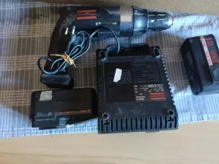 Taladro Atlas Copco con cargador y baterías. - Taladro con cable de alimentación. - Cargador de batería. - Dos baterías de 12V. El taladro no funciona. 2 baterías 1. Cargador.